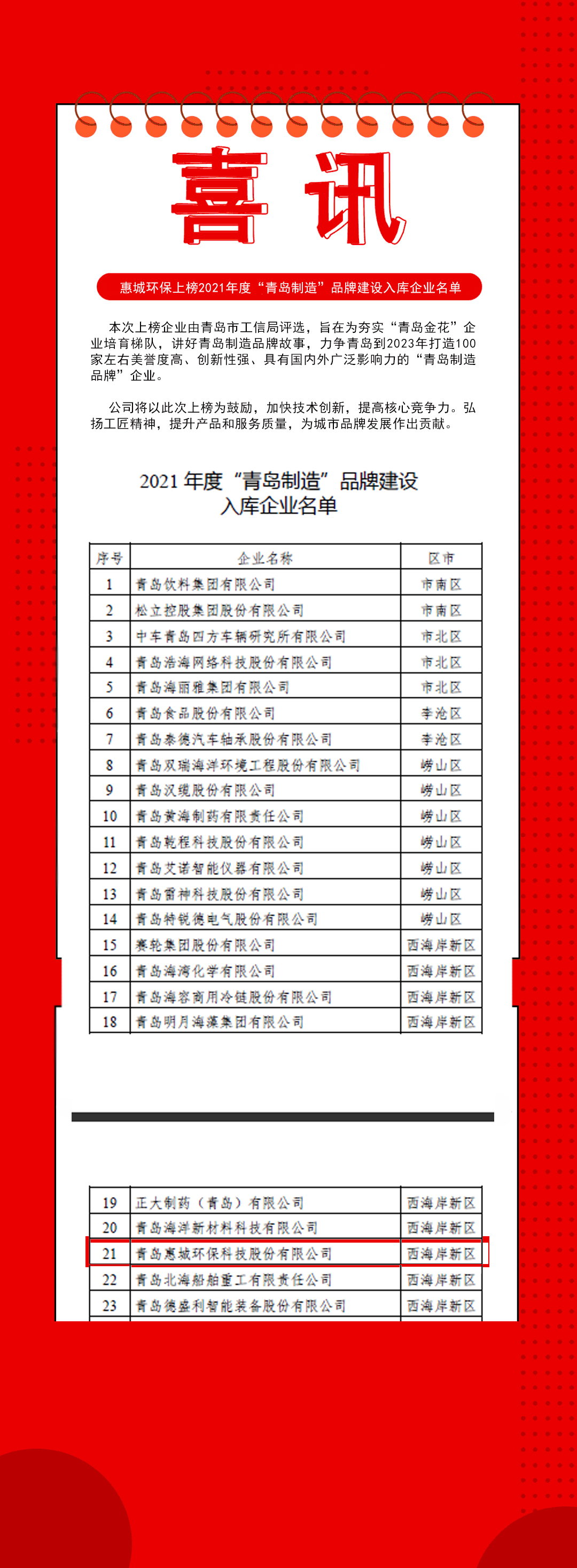 熱烈祝賀公司上榜2021年度“青島制造”品牌建設入庫企業(yè)名單